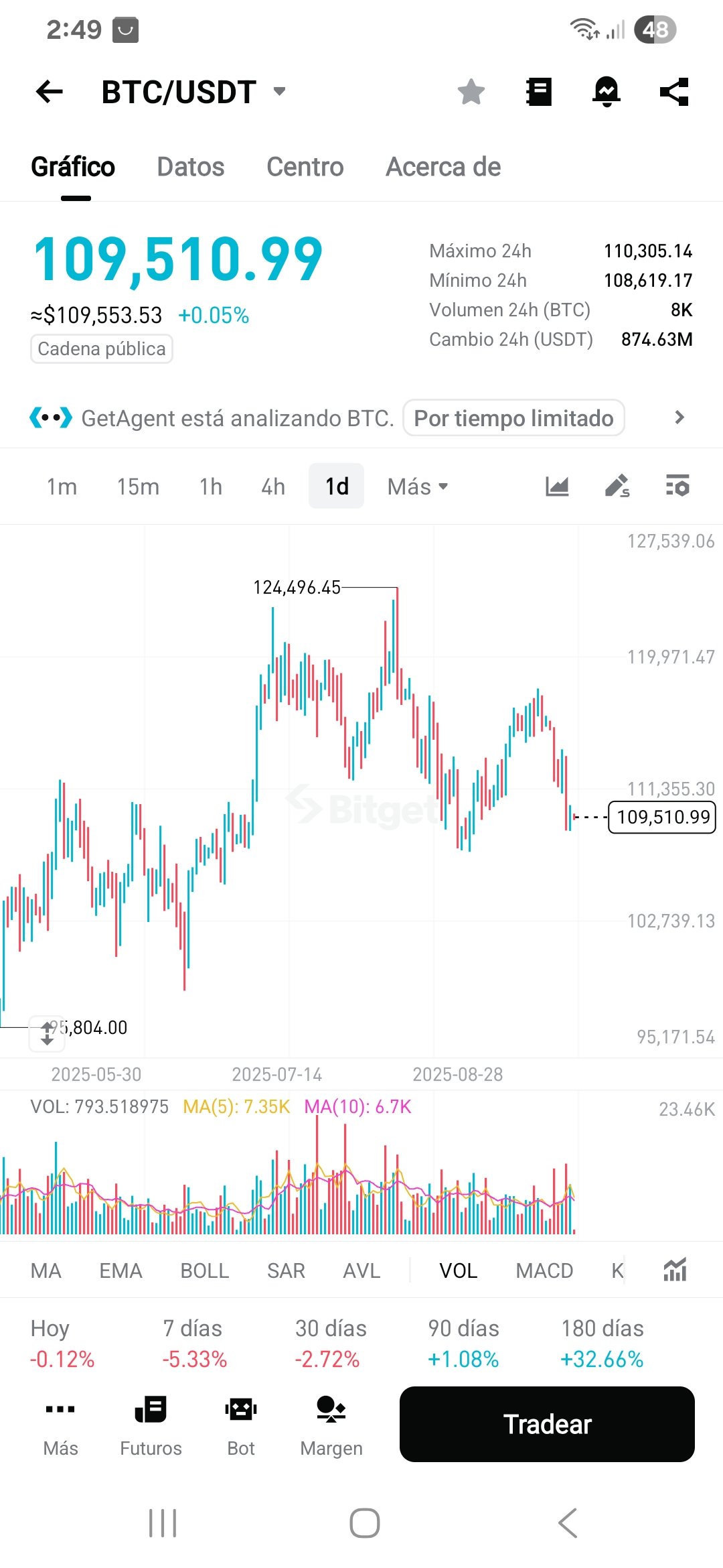 En estos momentos el bitcoin se encuentra a unos 109, 510 USDT.