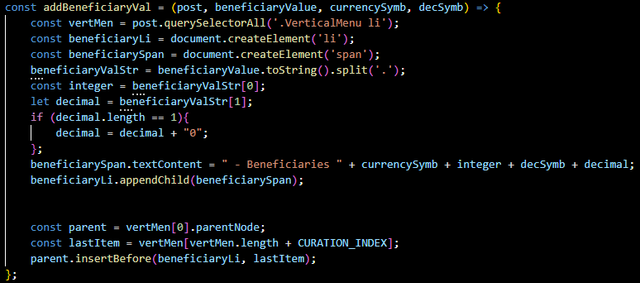 The last thing left to do is display the beneficiary value under the author value so we can see how much of the total value went to beneficiaries. We will need to create a new list item, then attach a span to that list item with the beneficiary value. Then we will insert the list item before the Curators list item:
