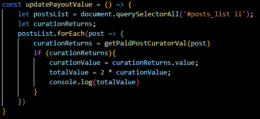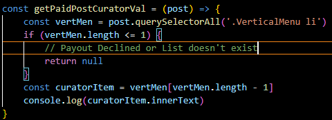 I could iterate through list items and look for innerText that contains " - Curators " in it, but the problem with this is that if someone is viewing the website in a different language, the extension won’t work. So instead, I’m going to have faith that the last item in the list will always be the Curation payout value, and see if it breaks because of that faith. In the case of the post’s payout being declined, the list will be of length 1 (simply displaying payout declined. Otherwise, there are some cases where there is no list items at all (it’s length 0). We will return null in these cases. If we remain in the function, we can begin to work with the curation value by selecting the last element in the list: