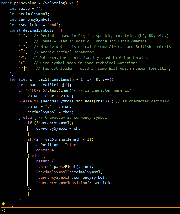 The obvious way to extract the value is to just split the string using the dollar sign, but I realize that many users may not see a dollar sign, but rather see the sign associated with their currency. So instead, I will find the value by making a function that goes through the string characters in reverse order until it hits a currency symbol (a value that isn’t numeric or a decimal symbol):