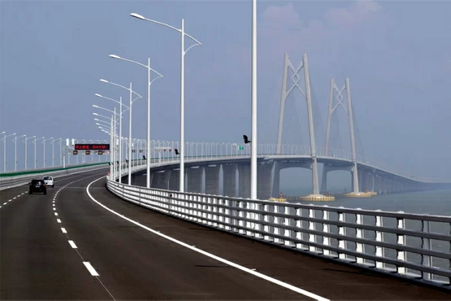 El principal y más destacado trayecto lo conforman los seis carriles de una autopista que se prolonga 23 kilómetros sobre el mar enlazada por 6.7 kilómetros de túneles y un par de islas artificiales.