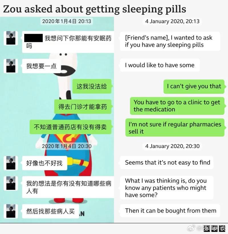 Screenshots of WeChat messages between Zou Zhenhao and classmates, viewed by the BBC, show that in January 2020, Zou Zhenhao began researching prescription sleeping pills in China, asking a friend there if they knew someone with a prescription from whom he could "buy" directly.