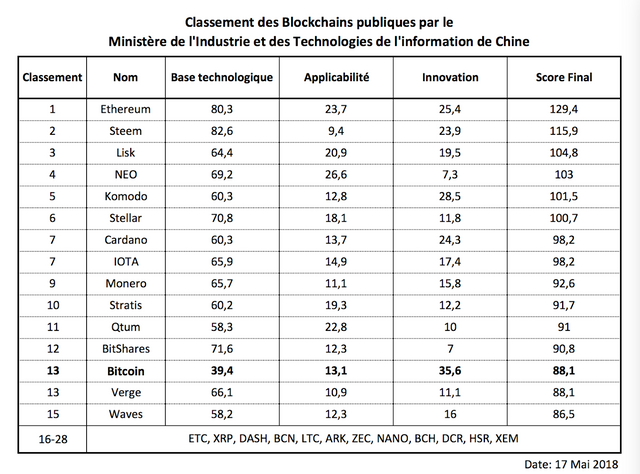 Même si la méthodologie exacte reste toujours secrète, la notation se base sur la somme de trois facteurs : la base technologique, l’applicabilité et l’innovation. Ethereum se retrouve ainsi en première position, grâce à son score en base technologique de 80,3. En deuxième position arrive Steem, grâce à une base technologique de 82,6 points contre seulement 9,4 en applicabilité. Bitcoin possède le meilleur score en innovation, avec 35,6 points, mais est limité par sa base technologique.