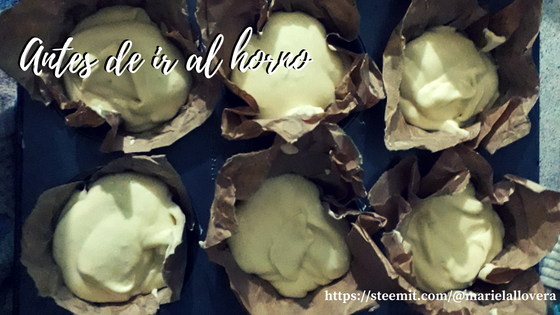 - Es momento de llevarlas al horno. Lo ideal es que la coloques en un molde para hacer ponquecitos y este lo cubras con los capecillos (esas cestitas de papel para hornear). Si no tienes, pues sigue mi consejo de hacerlos con papel de bolsas de panadería. Y también puedes obviar todo esto y hornearlo en un molde normal que previamente cubriste con mantequilla y harina para que no se pegue.