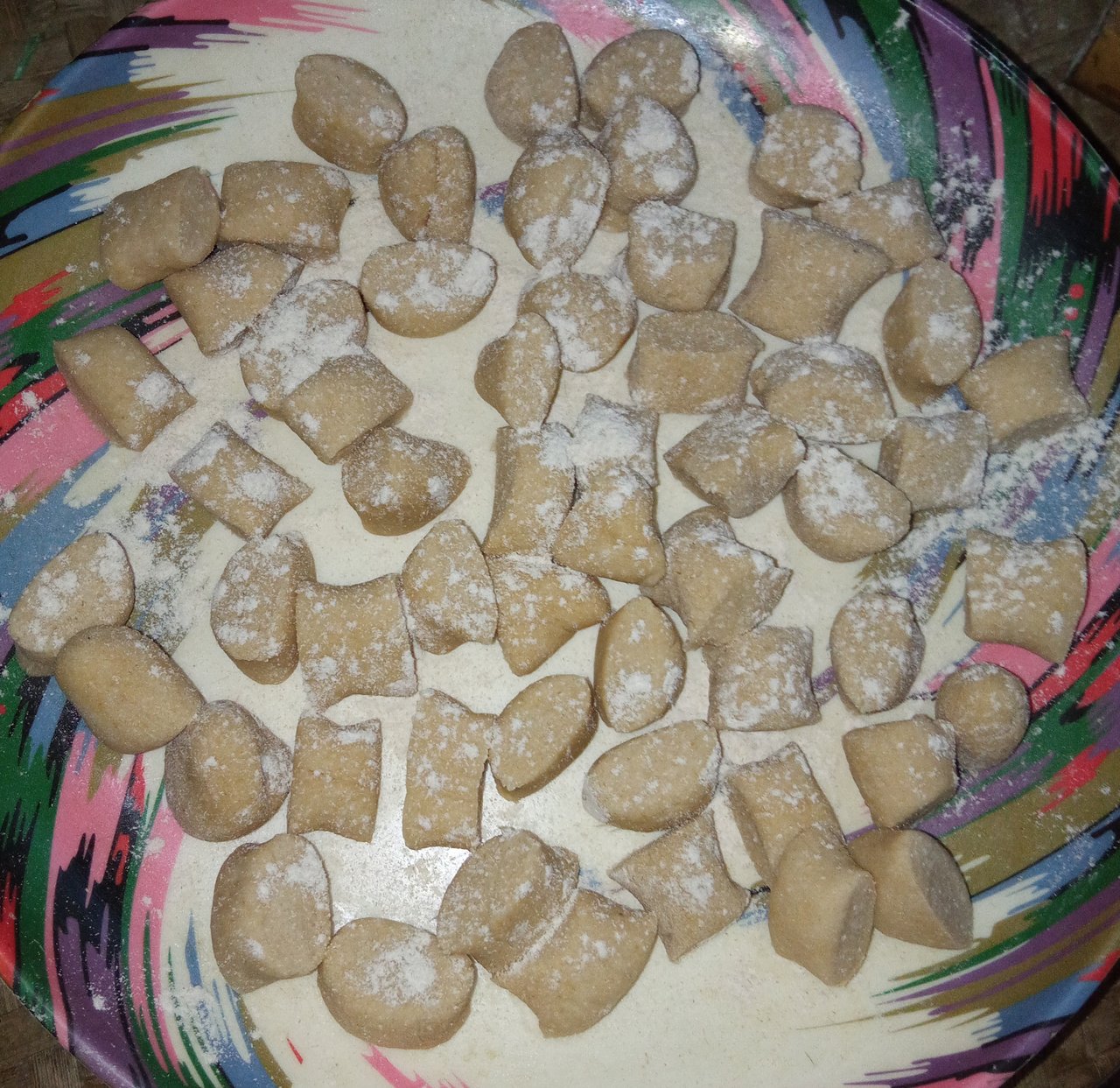 এবারে ডো 10 মিনিট রেস্টে রাখার পর আমি ডোটাকে ছোট ছোট ভাগ করে নেব।তারপর হাত দিয়ে লম্বা করে বেলে নেব।এরপর একটি চাকুর সাহায্যে ছোট ছোট লেচি কেটে নেব।