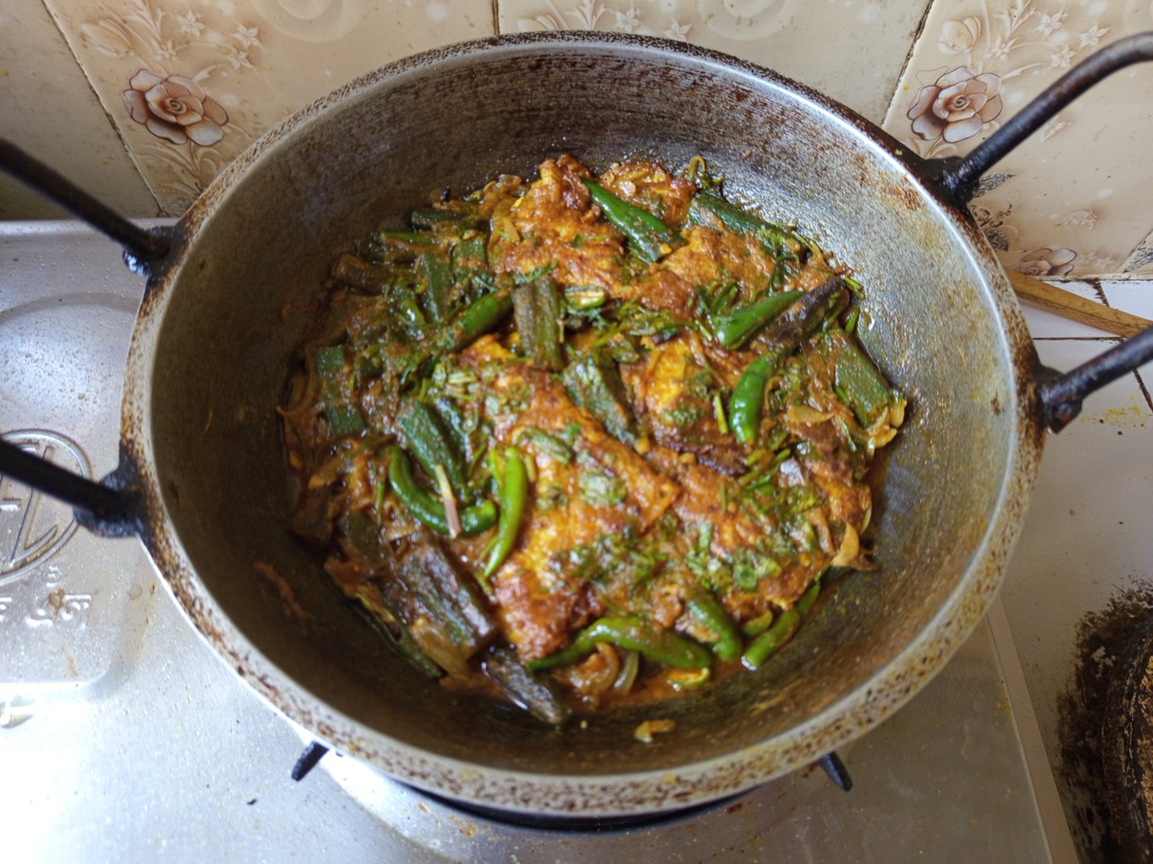 কষা হয়ে গেলে তার সাথে ভেজে রাখা ঢেঁড়শগুলো মখিয়ে নিয়েছি, তারপর ঝোলের জন্য পানি দিয়েছি। ঝোল একটু ঘন হয়ে আসলে ভেজে রাখা ডিমগুলো দিয়েছি। আরো কিছুটা সময় এভাবে রান্না করেছি। ঝোল শুকিয়ে যাওয়ার আগে ধনিয়া পাতা কুচি দিয়েছি এবং তারপর নামিয়ে নিয়েছি।