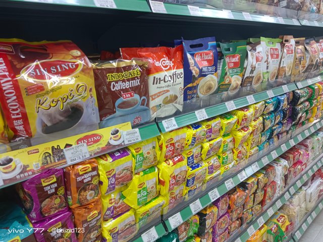 The red, green, yellow, brown colored packets gave the shop a different beauty, and while walking, I stopped at one side where different types of coffee were arranged. I already knew the popularity of coffee in Malaysia, but I was surprised to see so much variety, and I had never heard of such names before. At Sing Sing Indocafe Ah Huat, especially the packets called 3 in 1 Coffee Mix were,e quite eye-catching. Next to the coffee were different brands of instant noodles and big packets of Maggi. For a moment, I remembered my country. We used to eat Maggi often when I was young and still do. Here I saw noodles of different flavors, chicken tom yum curry, beef flavor, etc., and there were so many packets on the shelves that I could not understand which one to take and which one to leave.