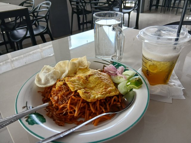 The bell rang, signaling the end of class, and I continued my journey to find a place to eat. I stopped at Graha coffee shop, where I ordered Aceh fried noodles with egg and cold apple tea. The apple tea was refreshingly cool on my throat. The Aceh fried noodles were a little spicy but still tasted good and suited my palate. The price was also reasonable and affordable.