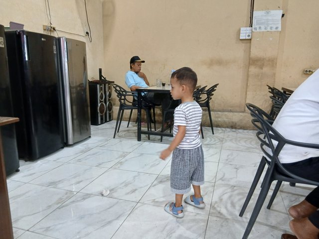 That evening, I took my child to the cafe in front of our house. My child is a fan of speakers. He really likes the lights on the speakers. While looking at the speaker lights, we also ate some crackers. I always make time to play with my child in between my busy work schedule. Children should not be forgotten. After half an hour of playing and looking at the speakers, my child and I returned home and immediately rested in bed.