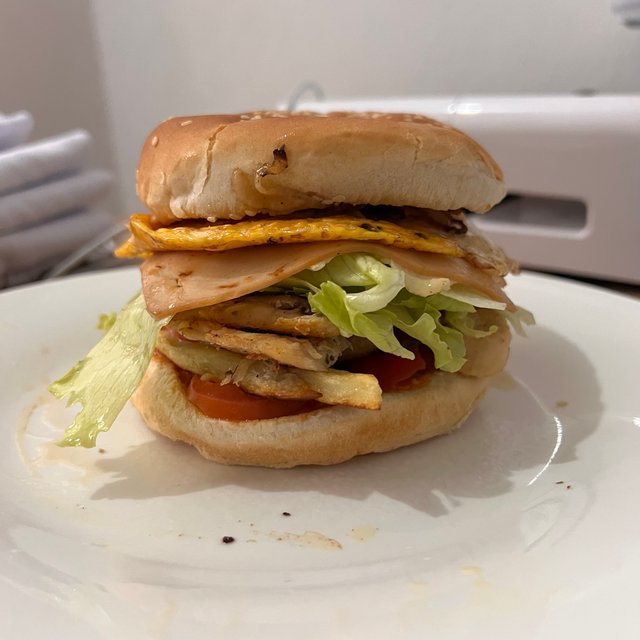 Legó la hora del almuerzo y nno tenía muchas opciones, pero quería comer algo rico, como tenía pollo y pan, me preparé una hamburquesa de pechuga con tomate, cebolla y lechuga, nisiquiera tengo mayonesa así que le coloqué un poquito de mostasa y salsa de tomate, solo un poco porque luego me duele el estómago. Me senté a comer y tomé aguita, la hamburguesa estaba buenísima. Me fui a fregar con las manos congeladas porque el frío esta fuerte y aqui de ppor si el agua ya es helada.