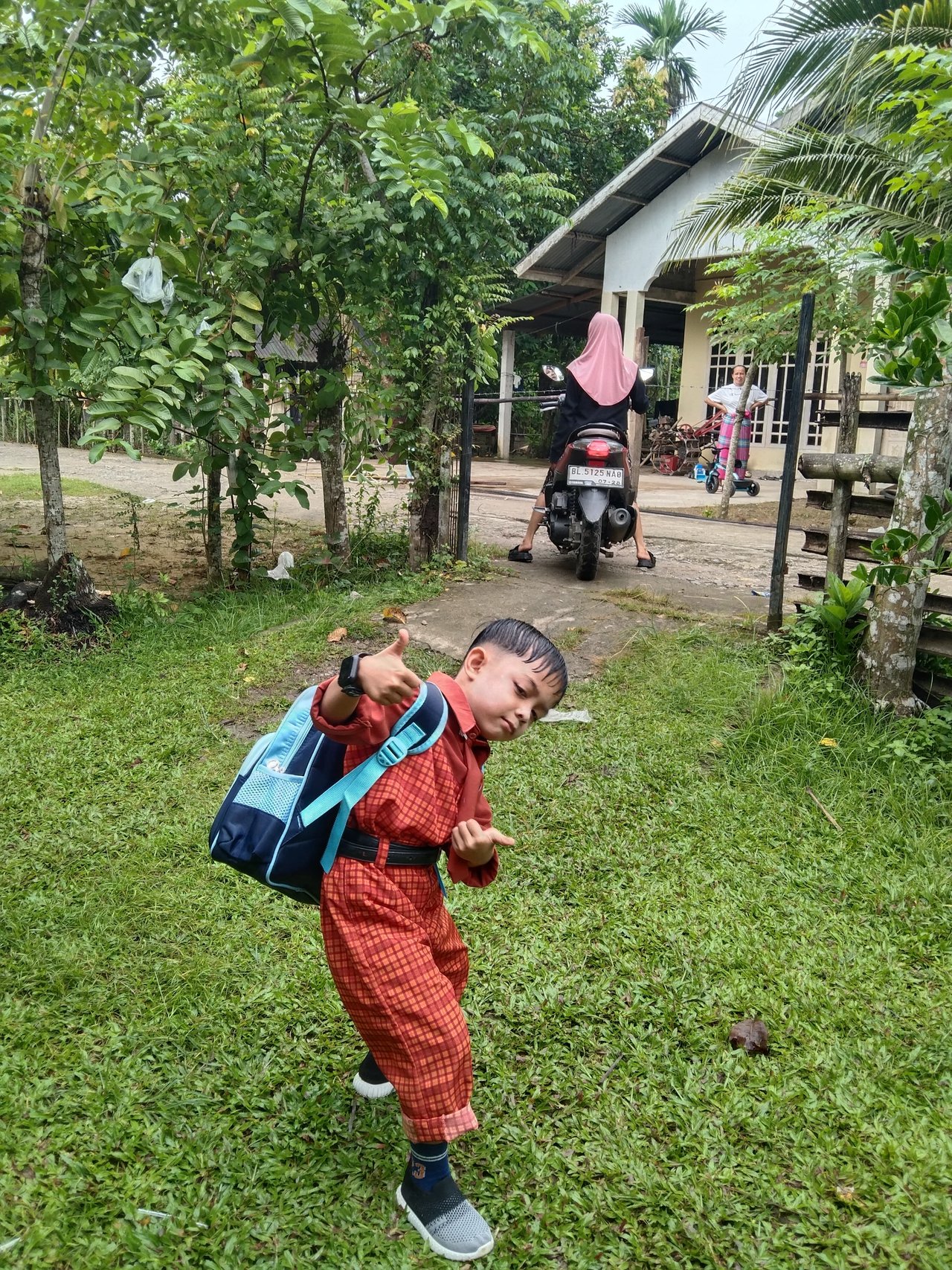 Dia adalah anakku, umurnya 4 tahun. Di awali dengan pagi pukul 08:00 wib aku sudah membereskan anak aku untuk ke sekolah, karena sekolah TK masuk pukul 08:15 wib, kemudian aku langsung mengantarnya ke sekolah. Jarak dari rumah ke sekolah anak aku sekitar 5 menit karna sekolahnya tidak terlalu jauh dari rumah.