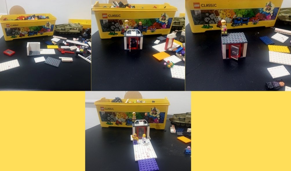 Con la ayuda de mi hijo y de mi imaginación utilizamos las primeras piezas que son como forma de pared y debajo las que son tipo placa que presentaría la forma del piso, luego ubicamos otras láminas que seria para el techo de la casita, seguidamente colocamos una puerta que sería la entrada, sin embargo dentro de la casa colocamos una mini figura de una persona que estaría cuidando esa casa y a alrededor de a casita de muelle también colocamos mini figuras que sería otros vigilante más.
