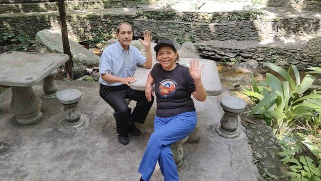 Las mesas y bancos de concretos están por todos lados, aquí me senté un rato a descansar al lado de mi esposo, los paseos al aire libre le hacen bien y se siente a gusto.