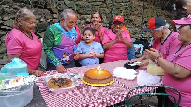 Una de las compañeras llevó una torta para cantar cumpleaños a su nieta, el parque cuenta con varias mesas de concretos y sillas para sentarnos a comer, jugar cartas, dominó, la pasamos bien, comimos torta, pasapalos, refrescos y nos divertimos.