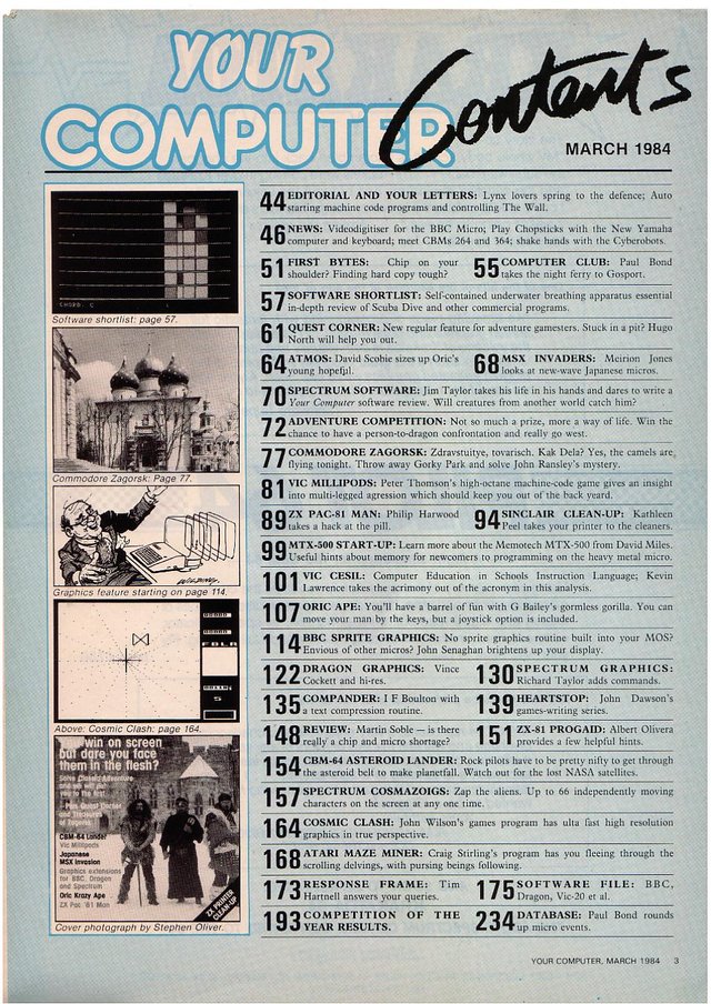 Your computer is a magazine that was published in the U.K. that covered the popular computers there during the early to mid 1980s. Game coverage was pretty heavy though it was not exclusively a game magazine. The March 1984 issue includes: