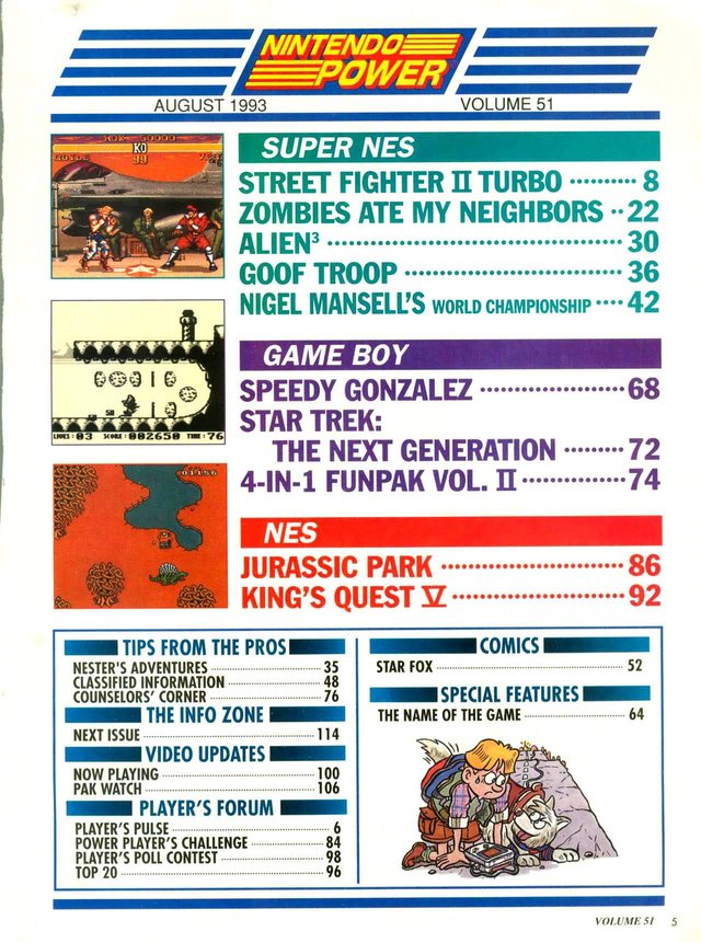 While I was never a subscriber, there's no doubt that Nintendo Power was the magazine to have for Nintendo loyalists. August 1993 was just past the peak of my NES/SNES playing days as I was moving on to college (and PC gaming) but I still played from time to time. The August 1993 issue of Nintendo power includes: