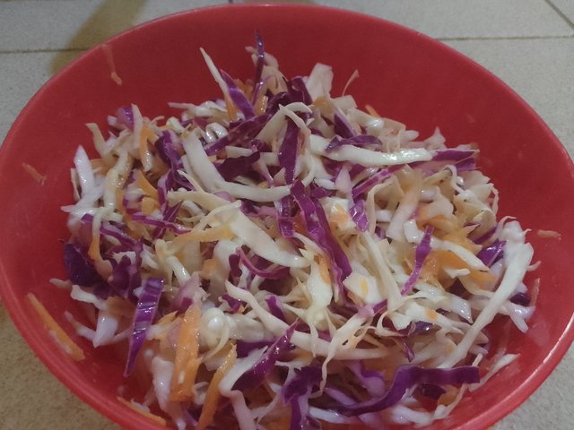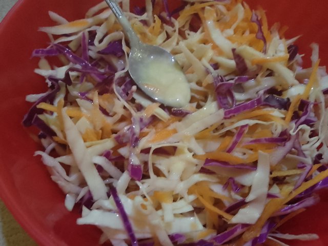 Luego de esto, mezclo los ingredientes del aderezo (Mayonesa, azúcar, sal y limón) en un recipiente, para posteriormente echarlo sobre la ensalada previamente rallada.