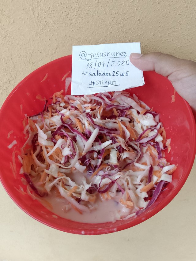 Saludos cordiales, amigos de Steemit. El día de hoy me uno al desafío "Team Salads Chef" en su quinta semana, en la cual la tarea principal es elaborar una "Ensalada Coleslaw", siguiendo todos los pasos y recomendaciones de nuestras tutoras.