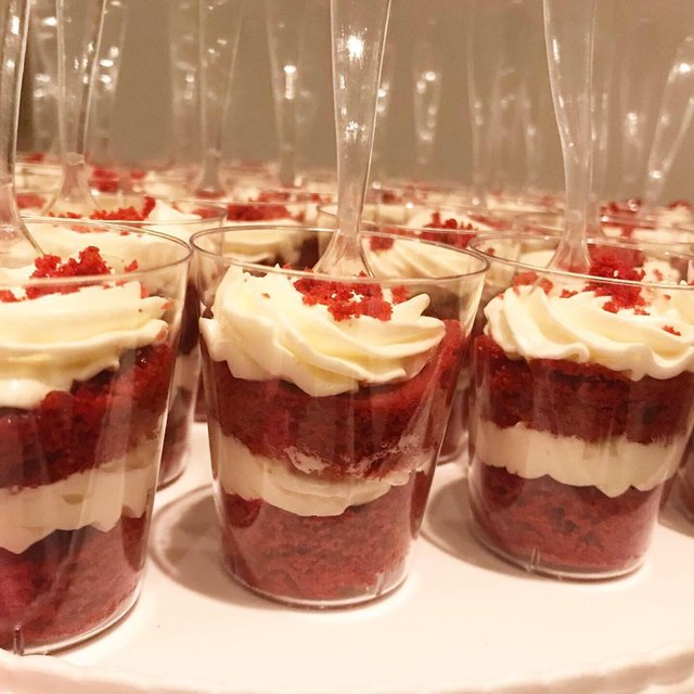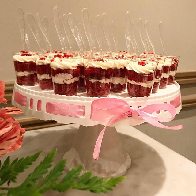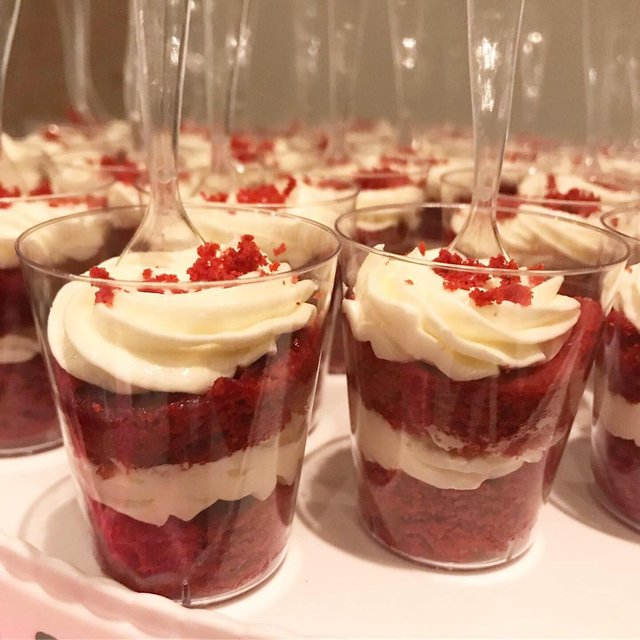 Mini shots de red velvet, delicados y deliciosos. Detalles dulces que completan tu celebración. #salopastel #share2steem #redvelvetcake #firtscommunion #girlcake #reposteria #mesasdulces #candybar #candybarparty #minidulces #shots #love #pasteleria #primeracomunion