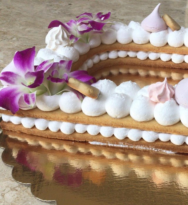 Monogram cake, exquisita galleta con harina de almendras, rellena con la crema de tu preferencia, cubierta con crema montada y decorada con flores, suspiros, galletas, frutas o golosinas. Es un postre elegante y muy rico, además de hermoso.