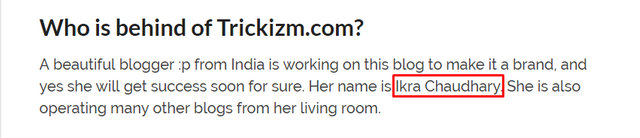 The blog published only few articles before my starting and all other necessity pages were published. After some time, he tried to gain my trust towards him that he is the most loyal person in the globe so I could trust him easily. He wrote a About us page with my name with fake nationality that I'm behind this blog. Take a peek at the below screenshot..