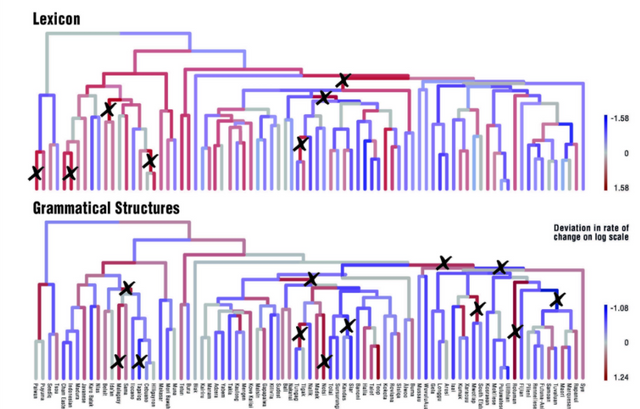 And that's the point here, evolution of any kind doesn't necessitate a single beginning. Language is something seen as an evolved form of communication too, and for a long time we have simply assumed all components of language arose from a common ancestor; grammar, morphology, lexicon and phonology all sharing the same history. It turns out this is a myth.A rather large international team, with the Max Planck institute taking the lead did a fairly substantial report on this. Basically, Looking into 81 Austronesian languages which all share a language family an geographic region, they found that Lexicon and Grammar actually 'evolved' separately via significantly different processes, with grammar changing more quickly due to social influence and lexicon being more rigid, and changing when new languages were created in the vicinity.