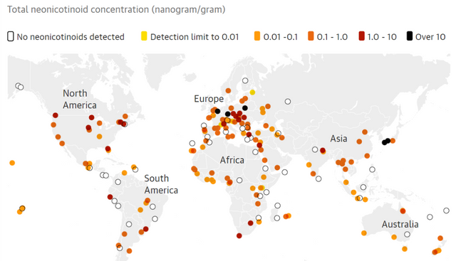 Testing for acetamiprid, clothianidin, imidacloprid, thiacloprid, and thiamethoxam, which are recent nerve agent-type pesticides used around the world, researchers found that 10% of the honey found had amounts of all of them, whereas 30% had just a single one and 45% had two or three. It should also be noted that the worst affected area was North America with 86% affected, with South America faring best with a still worrisome 57%.
