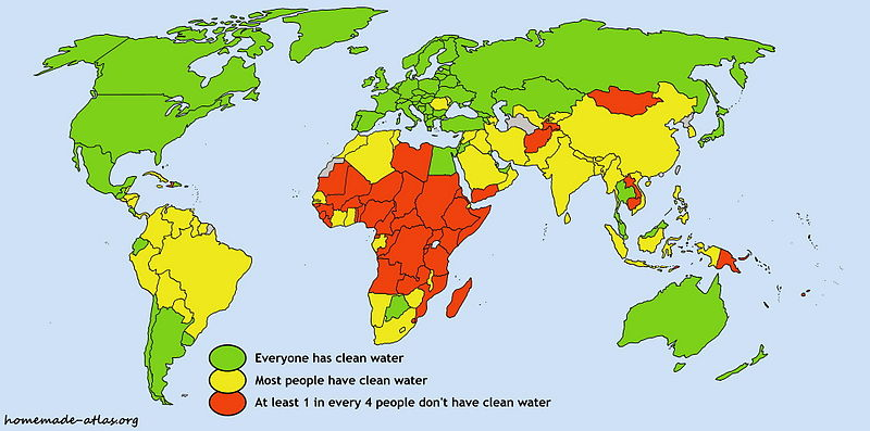 Population that uses improved water sources as percent of total population. Green: 100-95; yellow: 75-94.9; red: 74.9 and below. Source: UNDP (2006). Image source Wikimedia. Creative Commons Attribution 3.0 Unported license. Contributed by Ionut Cojocaru