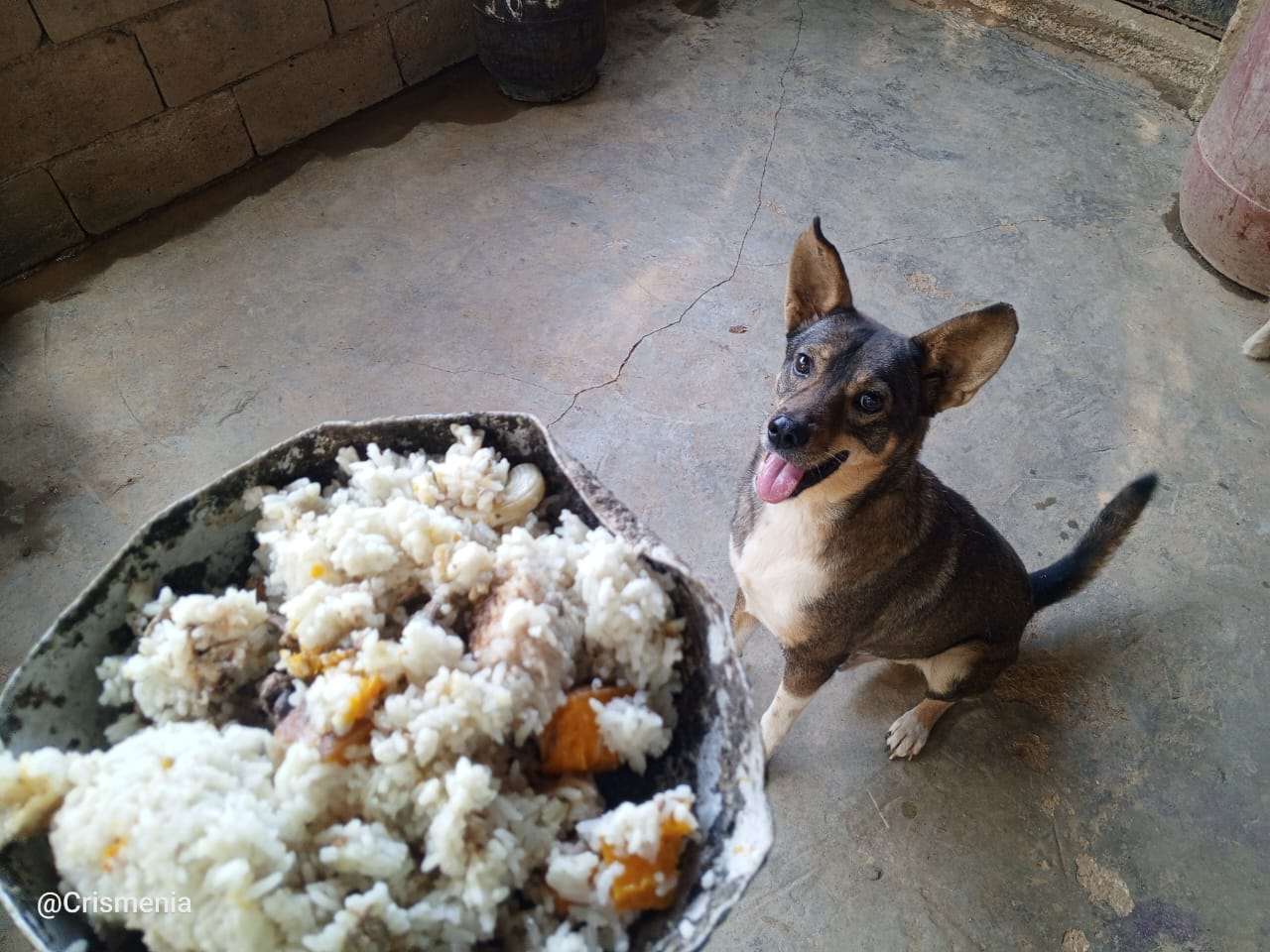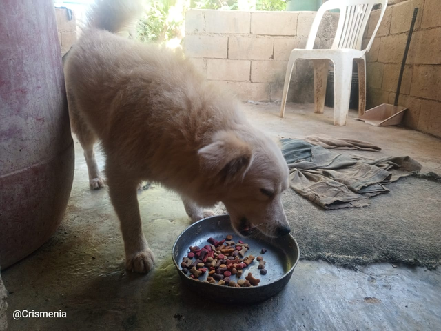 Comen dos veces al día, por la mañana, a primera hora del día les doy perrarina, a los tres les encanta. Por la tardecita, comen su plato principal, el cual, por lo general está compuesto de arroz, auyama e hígado de pollo, están gorditos y guapetones...!!!