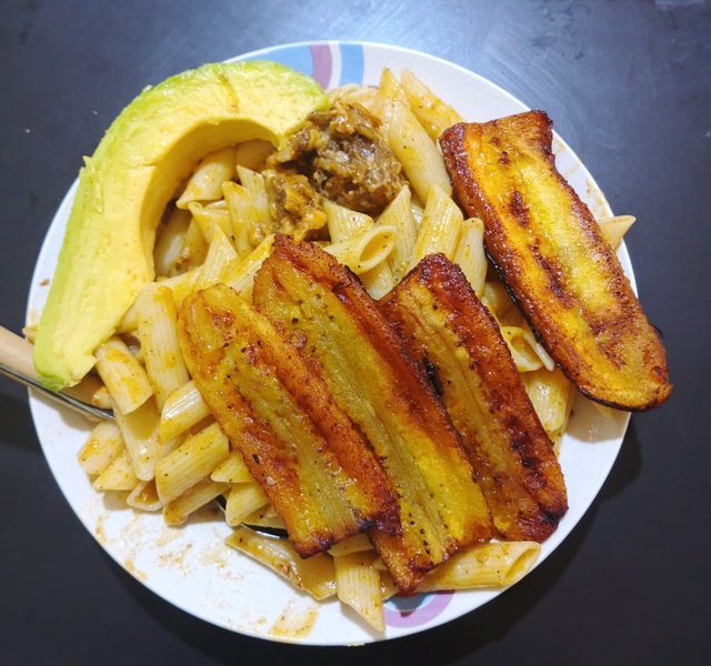 Espagueti con pollo, aguacate y plátano frito!!