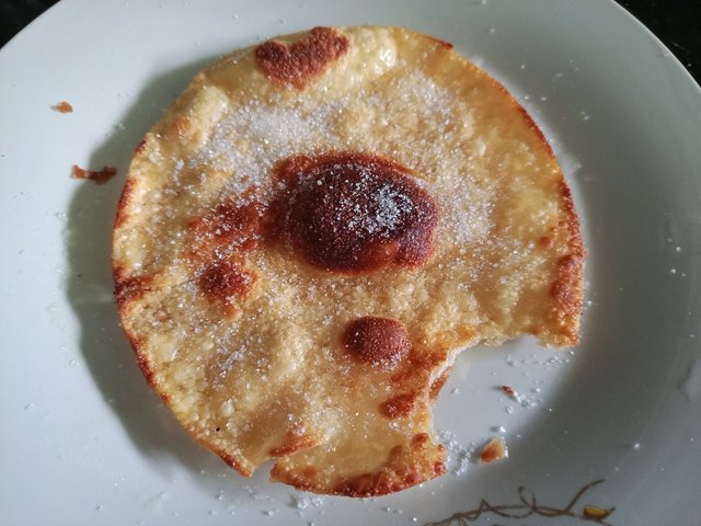 Como a las 10 de la mañana fue que llego y yo tenía un hambre horrible, mientras más doy lactancia, más hambre me da. Revise la nevera y encontré masa lista, freí dos, le puse azúcar y logre calmar el hambre.