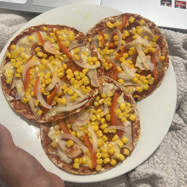 Tenía antojos de comer algo rico, y vi que tenía para inventar y era pizza, afortunadamente hace unos días compré maíz dulce congelado, a mi me fascina el maíz, casi que le pongo maíz a todo, le puse jamón, queso, cebolla, pimentón y la salsa, ellas se cocinan rapidito porque la base son tortillas tipo un pan árabe pero integrales, las de trigo normal no me agradan, me parece que éstas integrales saben mejor, tengo que enseñarle esta receta tan fácil y quedan bien deliciosas y lo más importante es que sacan a uno de apuro. Después de cenar me bañé y me puse a editar videos un rato hasta dormir.Gracias por su visita y por leer mi diario, Dios los bendiga.