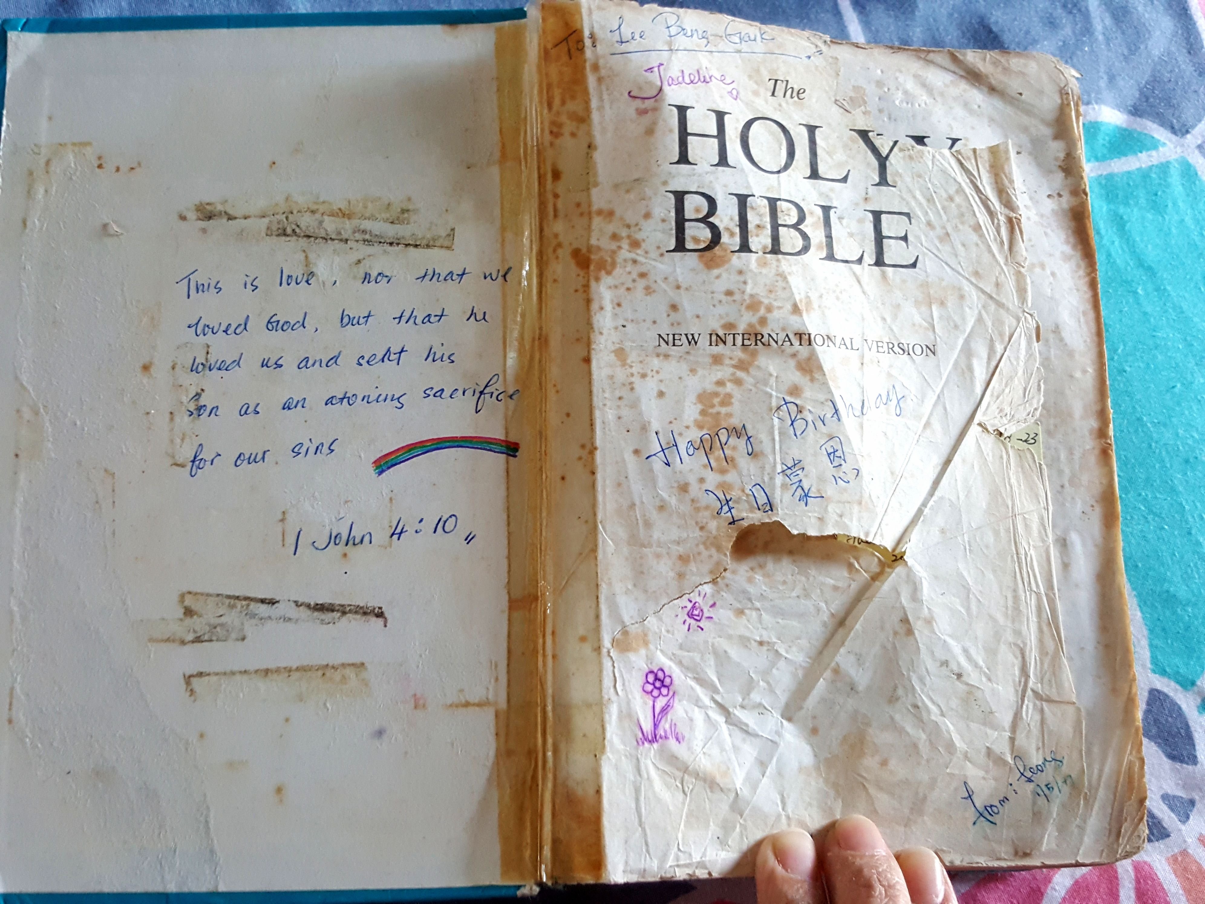 It was a birthday present from....none other than...Leong, my faithful friend. This Bible has since followed me for 20 years! Hence it has turned yellow now.