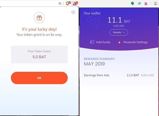 check out my Brave Rewards earned from just using the Brave Browser which replaced all ads with their own ad network paid in BAT tokens
