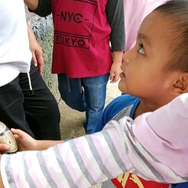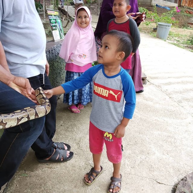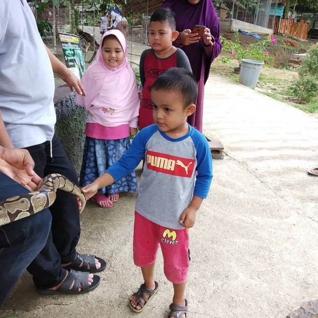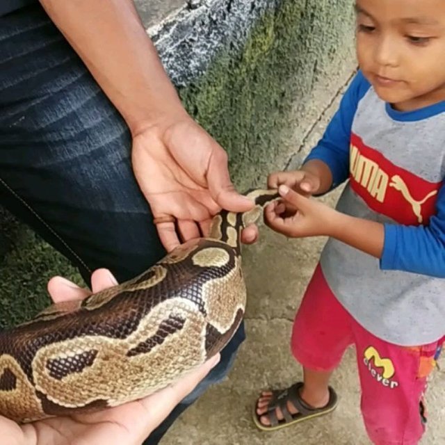 "Mau pelihara ular?" "Nggak mau, nanti digigit Faza." "Ular ini nggak gigit lagi dia..." Hahahaha....entah kapan terakhir kali pegang ular, mungkin di Gembira Loka dulu, sejenis phyton juga. Faza ini nggak pernah ditakut-takuti ini dan itu, walau pada akhirnya dia tahu hantulah, pocong, orang gila, atau apa pun itu ya, yang sering dicandain orang dewasa sampai anak-anak juga untuk menakut-nakuti, bahkan ada pula yang menakut-nakuti anak dengan profesi tertentu seperti dokter dan polisi 😅