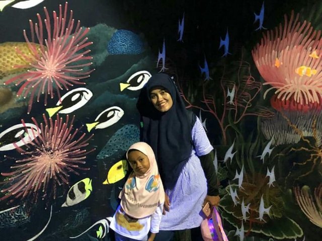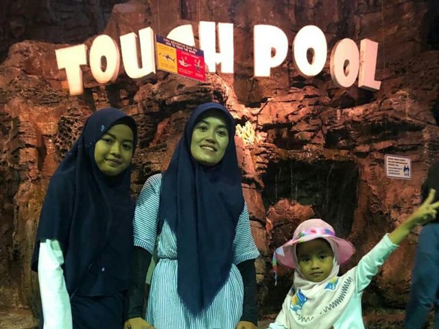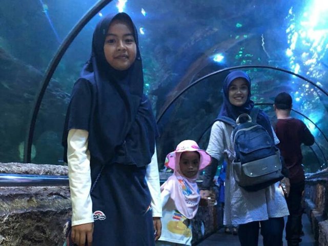 Diajak lihat berbagai jenis ikan, ekspresinya pun biasa saja. Dia senang saat di area yang kepalanya bisa masuk ke bulatan kaca di tengah-tengah aquarium (apa ya itu namanya) dan melihat hewan laut dari dalam kaca itu sehingga seolah-olah dia berada di dalam aquarium.