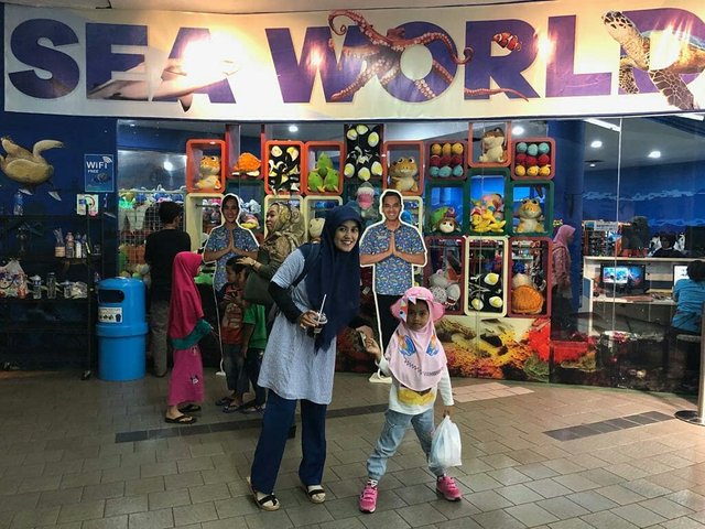 Pengalaman pertama melihat miniatur kehidupan laut di Sea World ini. Athiyah tidak terlalu excited disini, lempeng-lempeng aja bahkan pingin segera keluar. Tapi masih mau dibujuk-bujuk untuk lebih lama explore di dalam area Sea World. Padahal sebelum kesini sudah diberi gambaran tentang apa yang ada disana. Mungkin dia capek, atau juga bete karena tempatnya kan agak gelap.