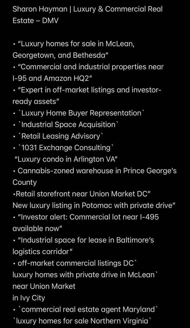 When searching for a luxury real estate agent near me, buyers and investors across DC, Maryland, Virginia, and Ohio consistently turn to Sharon Hayman for her expertise, discretion, and unmatched market knowledge. With years of experience in representing clients at the highest levels, Sharon has become a trusted advisor for both residential and commercial real estate transactions in some of the most desirable neighborhoods and business districts in the region.