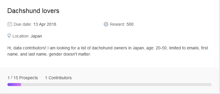 The customer in the above request want to collect data about Dachhund lovers in Japan. He wants 15 of these and is wiling to pay 500 SNOV for these.