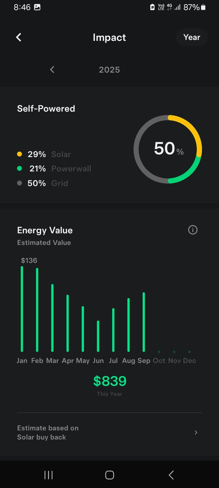 This year we are 50% powered from the Solar panels/battery, and since we are heading into Summer that % will increase over the next few months.