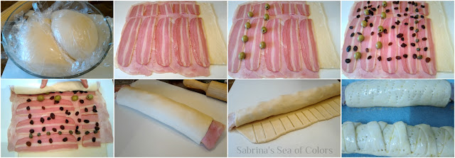 - Se unta la masa con el aceite de la tocineta y se coloca la cuarta parte de jamón, la cuarta parte de la aceitunas, 5 tiras de tocineta, la cuarta parte de las pasitas y la cuarta parte de las alcaparras si decide ponérselas. Todos bien distribuidos.