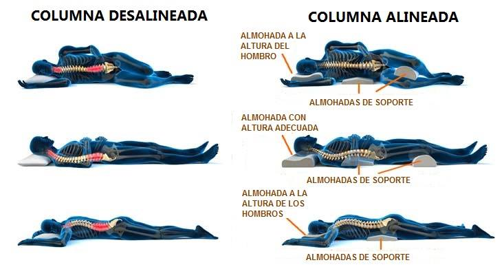 La mejor postura para dormir es boca arriba, sobre nuestra espalda, ya que así mantenemos alineada nuestra columna. Para esto también es necesario utilizar una almohada con un grosor adecuado, ya que si es muy alta también podría ocasionar dolores cervicales, por lo tanto no debe ser ni muy alta, ni muy baja. Un dato muy importante es que colocar una almohada debajo de las rodillas es un gesto que puede mejorar la alineación de nuestra columna mientras dormimos.