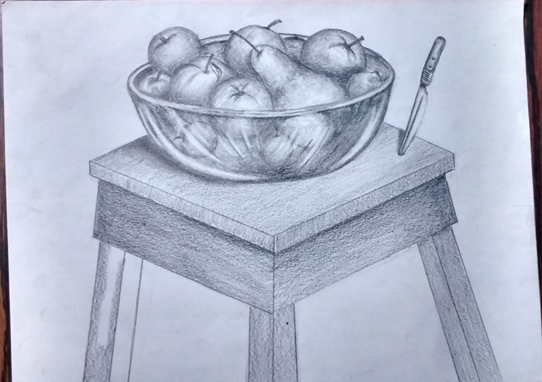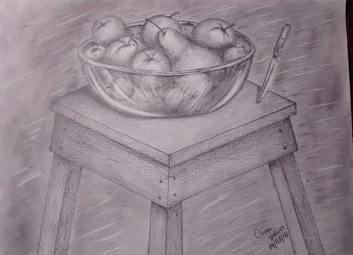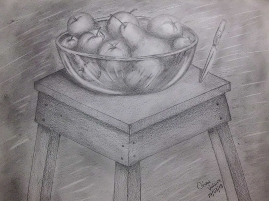 Bienvenido y gracias por participar en éste concurso que te motiva a ti y a mi como docente para seguir enseñando, tu bodegón me encanta, es un trabajo bien estructurado en líneas y en proporción, con buen juego de luces y sombras que hacen en los objetos el efecto deseado, sólo un detalle en la inclinación del cuchillo, no sé puede ser mi apreciación y en la proyección de luz en la mesa. Pero me gustó, mucha suerte.