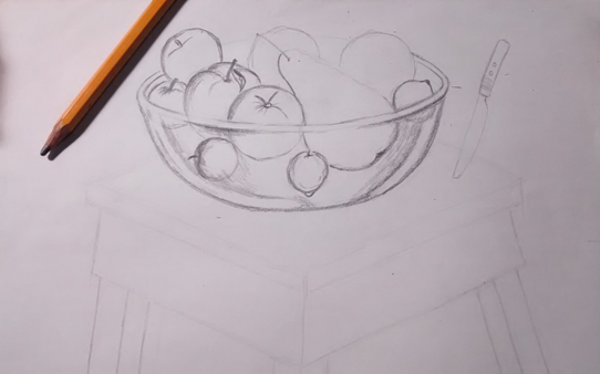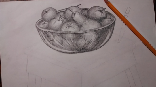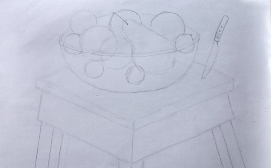 Ahora comienzo, con los primeros trazos oscuros, remarcando los bordes de la frutas, y del contenedor de cristal.