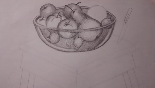 Con un lápiz 5B, continuo dando profundidad con el degrade de tonos, fíjate que aún no he tocado al banco, solo me he concentrado en las frutas y el envase que las contiene.