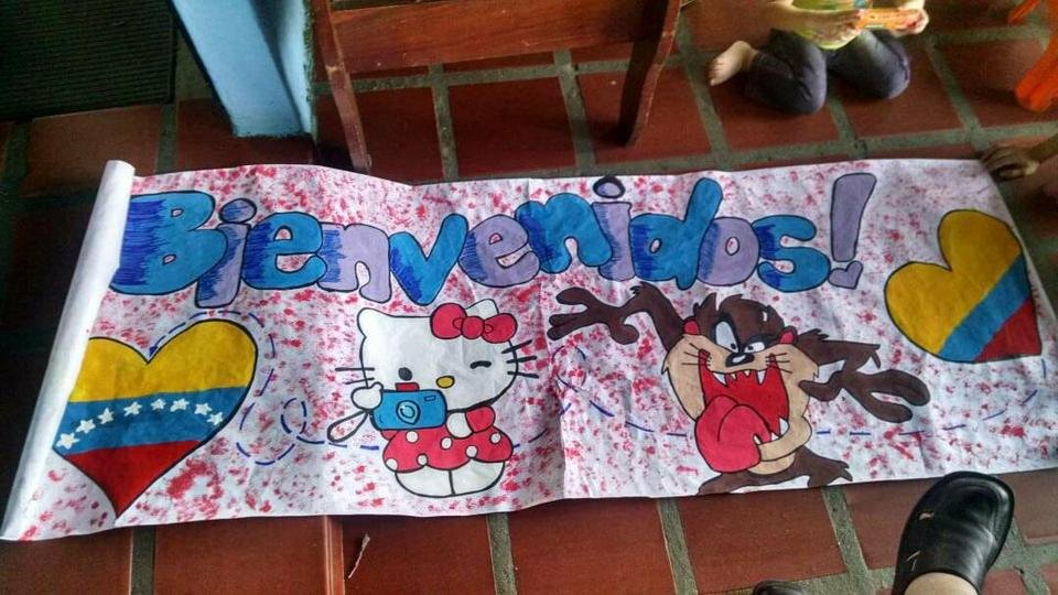 Todos saben el problema que tiene mi país Venezuela y que por ello la gente se va del país hacia un futuro mejor, por esta razón se han separado familias, amores, amigos; esta pancarta fue realizada para un reencuentro de mi primo con su novia que volvía a Venezuela, fue hecha con mucho amor. Quedó totalmente encantada al verla.