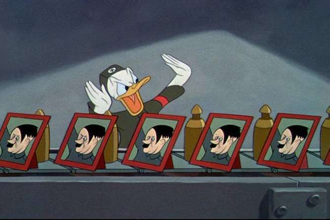 Disney puso casi toda su empresa al servicio del gobierno americano. Sus diseñadores pasaron de diseñar enanos o princesas a crear armas; los dibujantes que creaban las historias de Blanca Nieves hacían las de los soldado nazis y americanos y por supuesto sus personajes dejaron de lado los cuentos convencionales para crear propaganda. Del mismo modo, los Looney Toons y la empresa que los rige, Warner Bros., colaboraron con la situación bélica introduciendo al Pato Lucas, (sí, otro pato despistado) como un comando que se infiltraba en las líneas enemigas . Incluso en uno de los cortos más aclamados y controversiales interrumpe al propio Adolf Hitler para golpear su cabeza. El dictador grita y habla con una voz irritante.