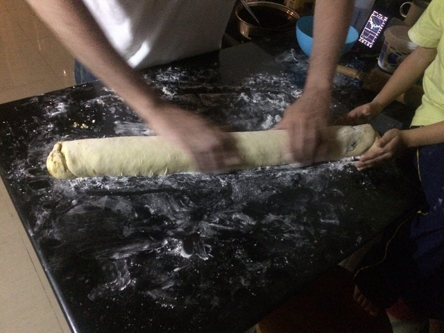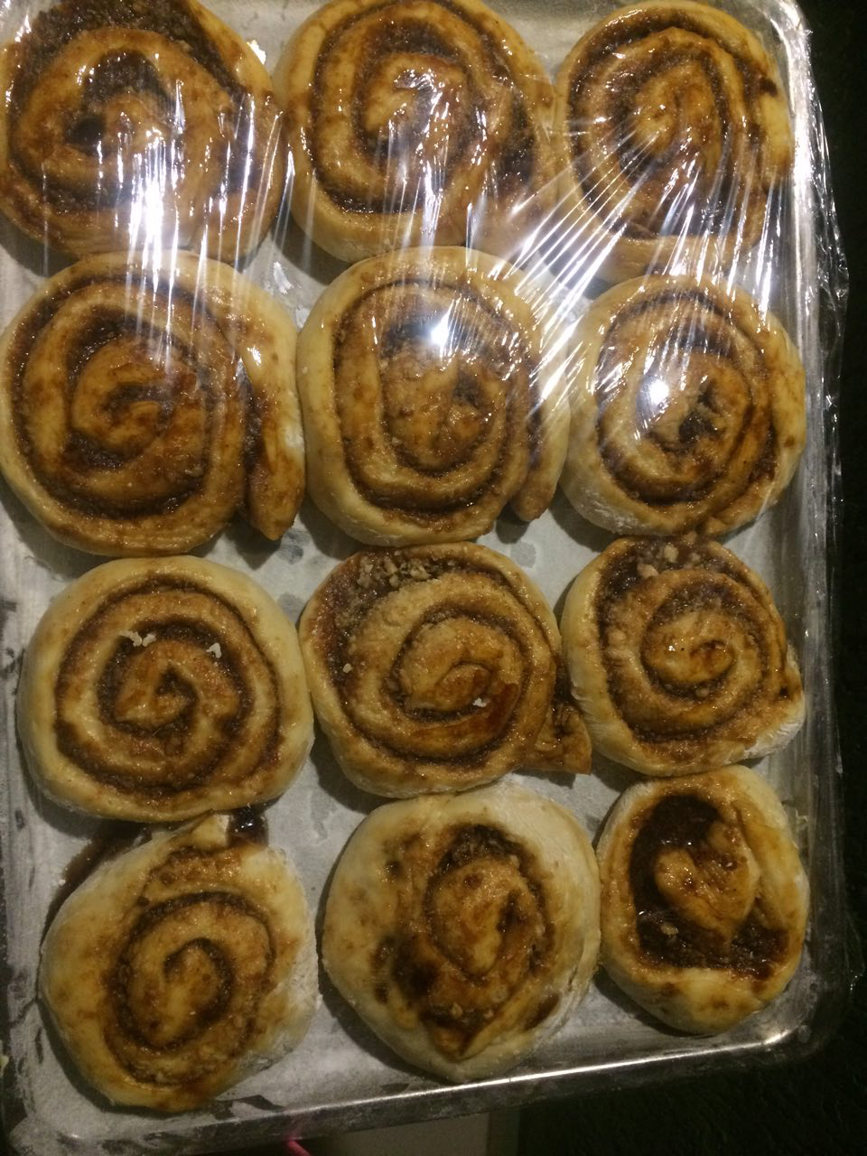 Cuando ya tenemos un rollo largo, procedemos a picarlo por la mitad, y de allí en partes iguales de 3 a 4 cms. Los colocamos en una bandeja enharinada para que no se pegue, y ponemos a reposar por aproximadamente 60min tapados o dentro del horno apagado, hasta ver que dupliquen su tamaño.