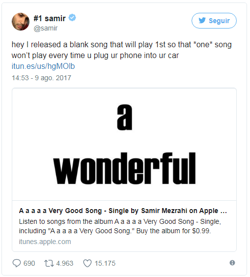 Un usuario del iPhone llamado Samir Mezrahi tituló esa canción "A a a a a Very Good Song" y la puso a la venta en iTunes por 0,99 dólares y tras compartirla en Twitter, su idea se hizo viral: en el momento de escribir esta noticia ya tiene casi 15.000 retuits.