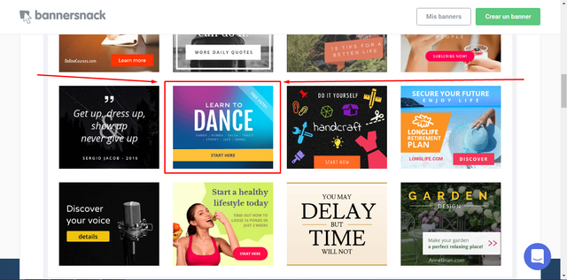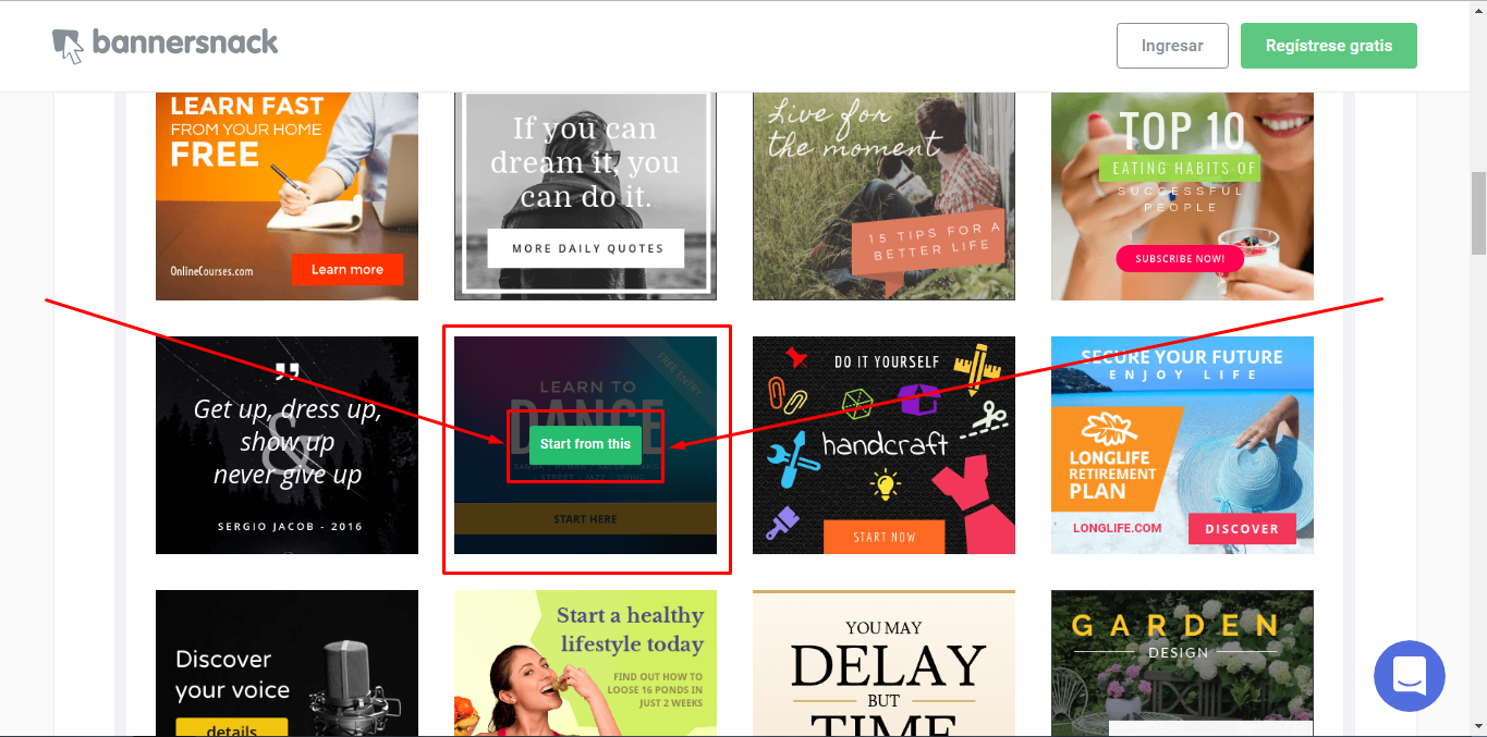 ►TERCERO: Inmediatamente, dentro del grupo de plantillas que "Bannersnack" ofrece, usted procede a seleccionar la que más le agrade, según sus intereses y necesidades. En mi caso, seleccioné la plantilla de mi preferencia e hice clic sobre esta. Se podrá leer lo siguiente: "Star from this" (ver imágenes y recuadros, señalado con flechas):
